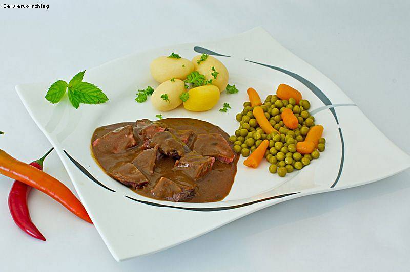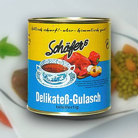 Zubereitung: Dieses Gericht ist tafelfertig. Den Doseninhalt nur kurz erhitzen, bitte nicht kochen. Servieren als Beilage zu Kartoffeln, Klößen oder Spaghetti. Als Krüstchen-Gulasch mit Brot - verdünnbar mit 20% Wasser.